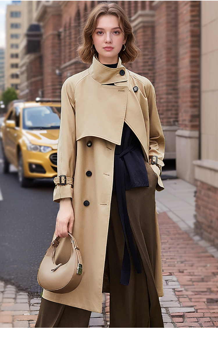 2024 Autumn New Lace-Up Stand Collar Mid-Length Female Thin Over Knee Trench Coat Khaki