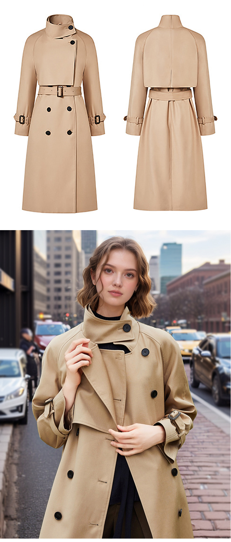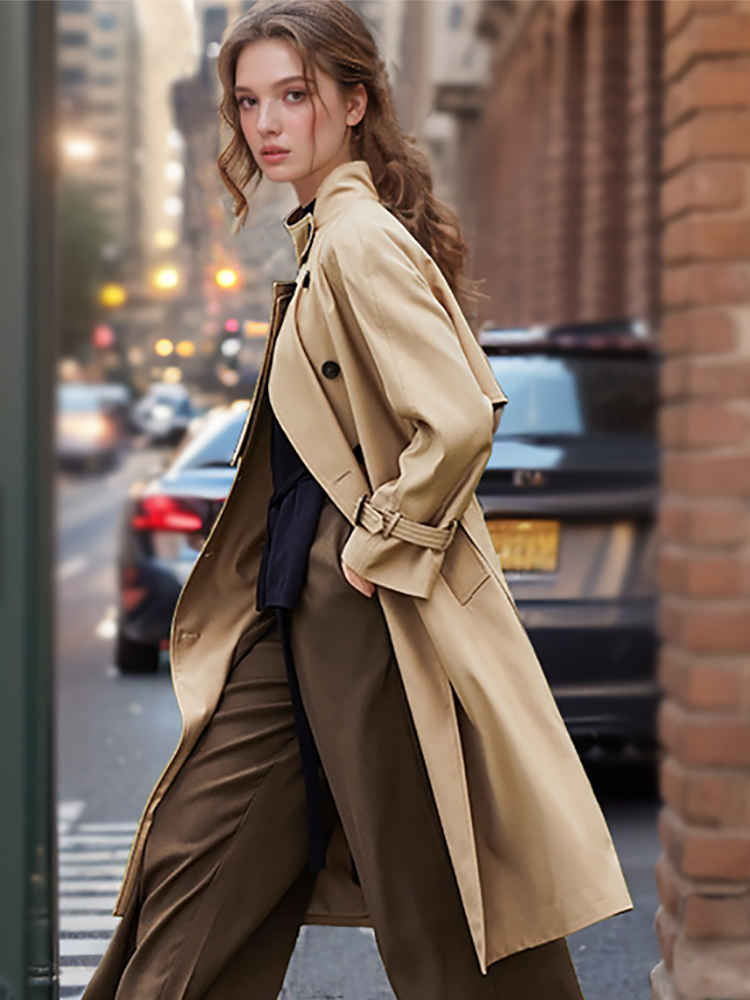 2024Women's Double Breasted Long Trench Coat Lapel Mid Length Jacket with Belt Coat