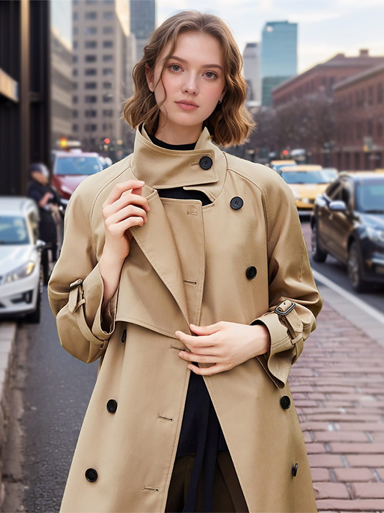 New Women's Double Breasted Long Trench Coat Lapel Mid Length Jacket with Belt Coat