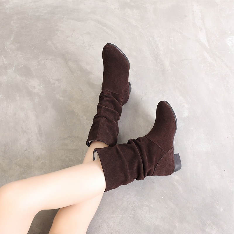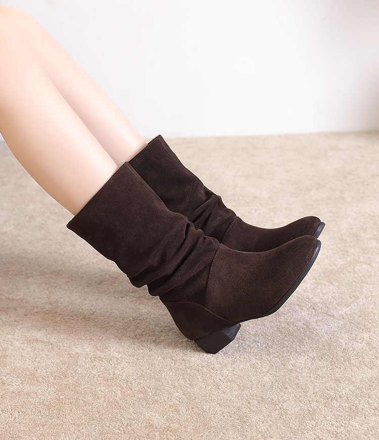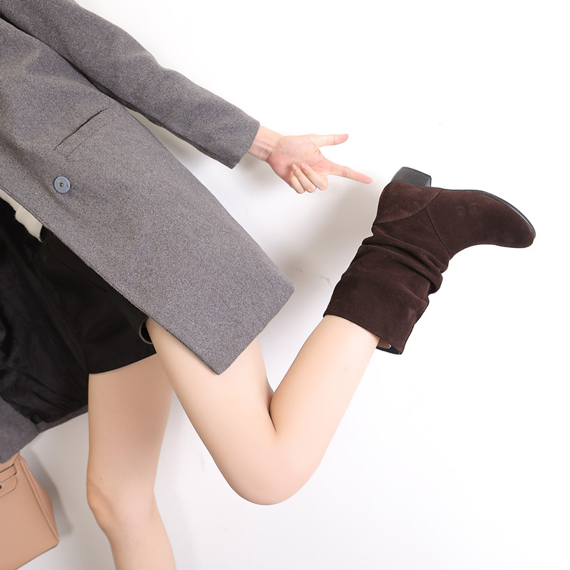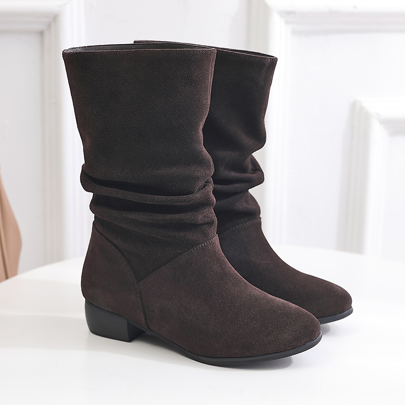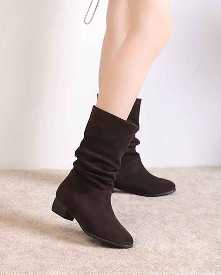 This loose mid-calf boot has a zipper on the inside for easy on and off, keeping your feet comfortable all day long.