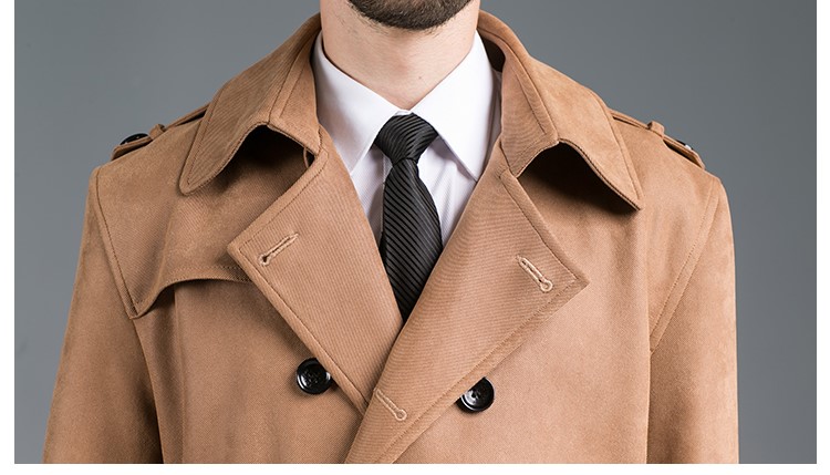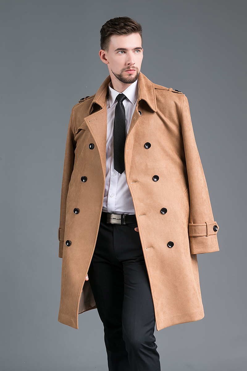 DEERSKIN VELVET FASHION SLIM-FIT DOUBLE BREASTED MID-LENGTH TRENCH COAT CAMEL