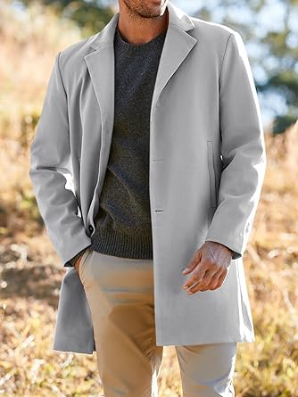 Elegant men's trench coat, single-breasted, with lapel and two side pockets, streamlined back, long regular fit, long sleeves. Men's winter coat for casual wear, business, dating and parties.