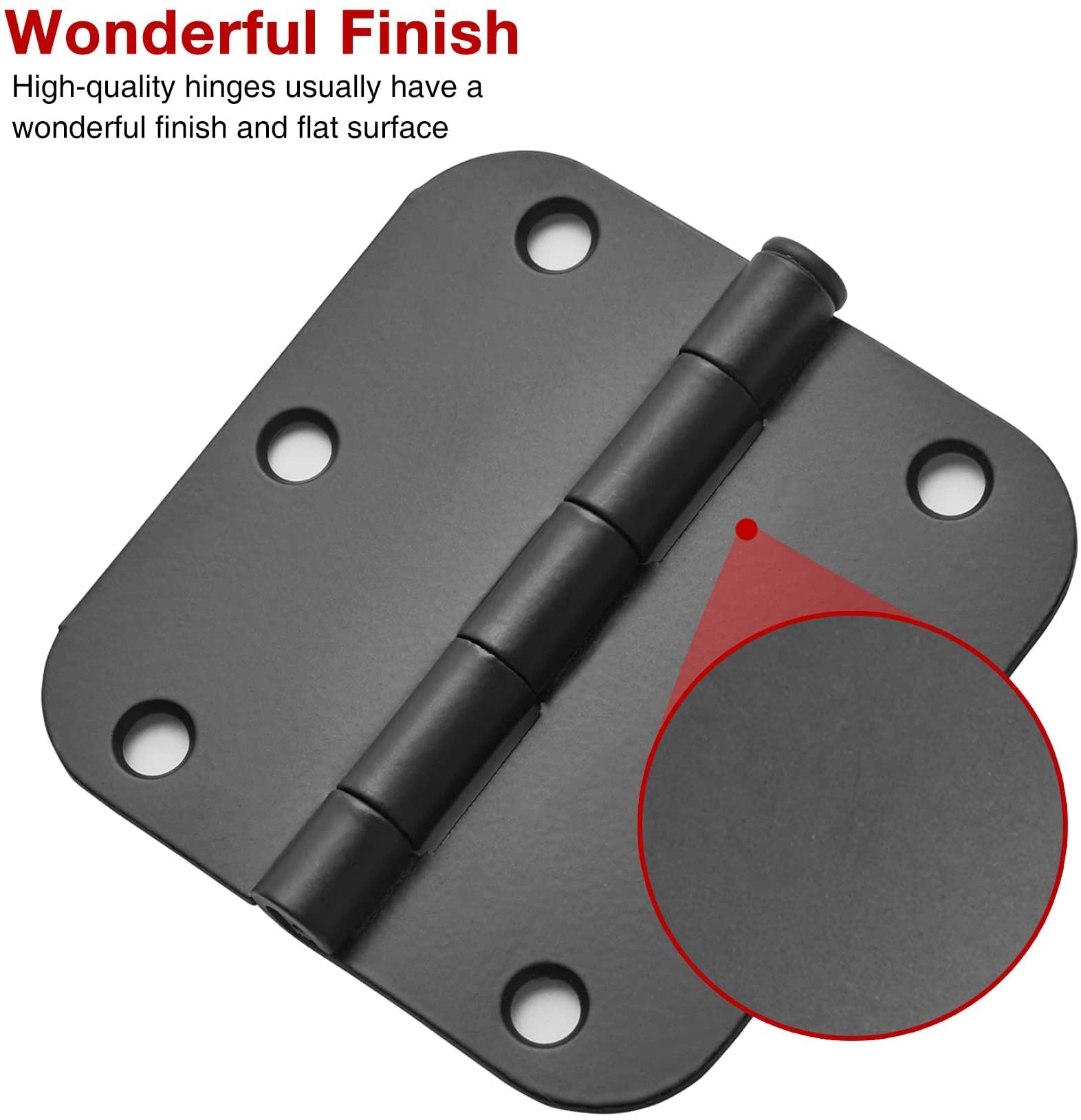 The door hinge is matte black 3.5" with 5/8 rounded corners and 6 holes for front doors, cabinets, wooden boxes. The Security Black Door Hinge 3.5" includes 180 free screws for quick and easy installation. The matte black door hinge can be rotated 270 degrees. The extra long screws are especially handy when replacing existing hardware with the same hole pattern. Product ReviewsRecently Viewed
