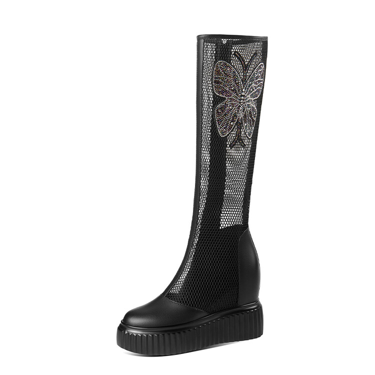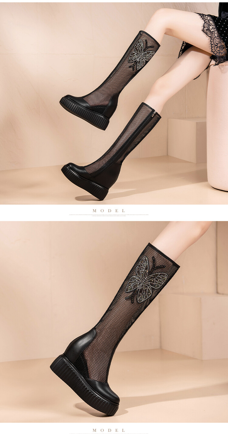 Summer Slimming Wedge Heels Inside Heightening Leather Mesh Hollowed Out Black Thigh-High Boots